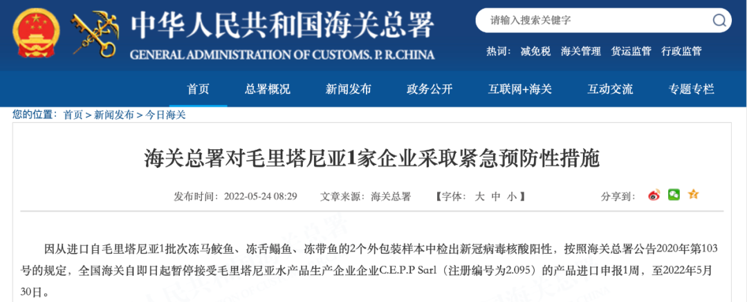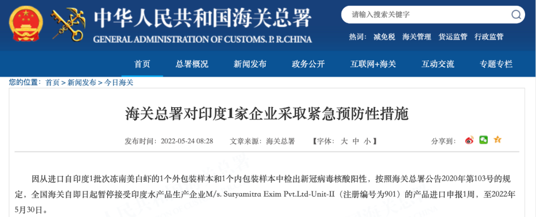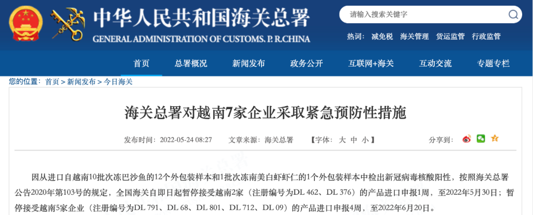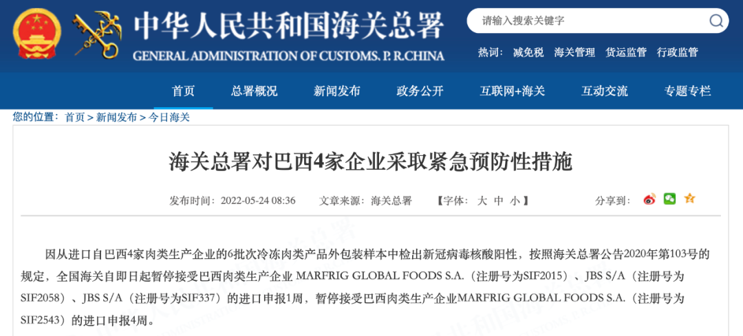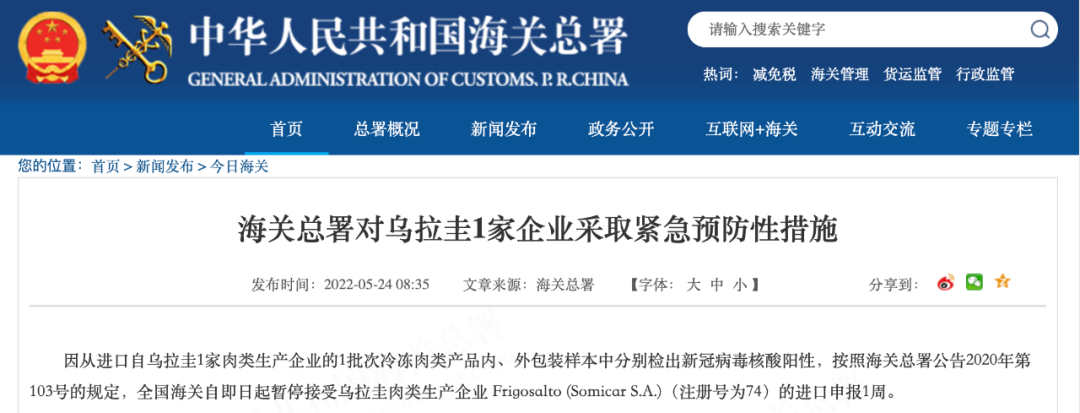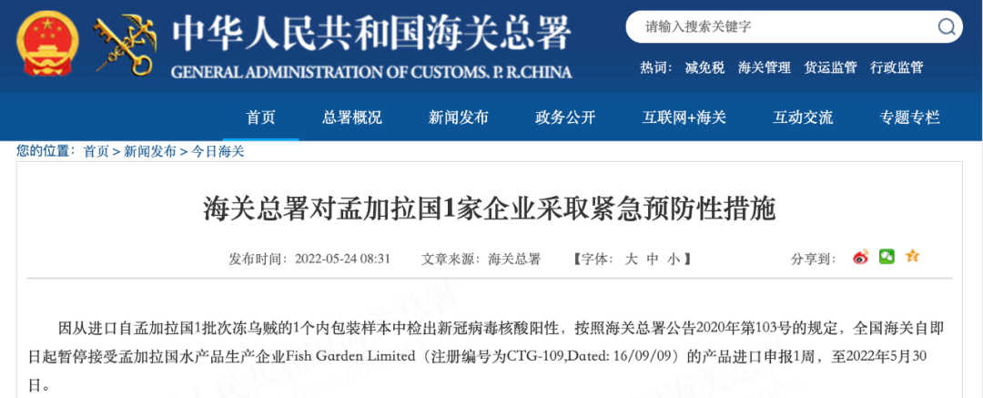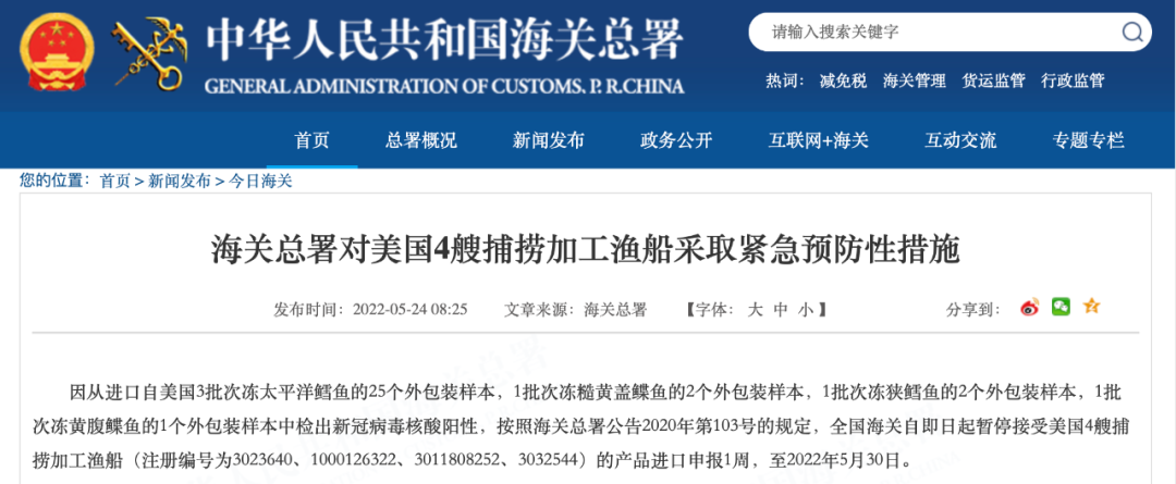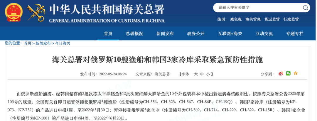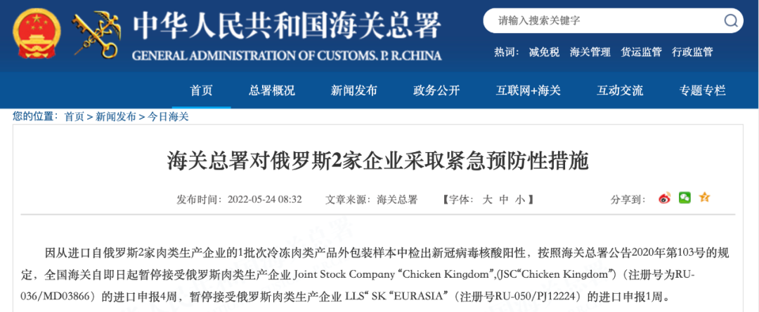 5月24日 海关总署官网连发多则公告 以下进口产品中 检出新冠病毒核酸阳性 ↓↓↓ 海关总署对美国4艘捕捞加工渔船 采取紧急预防性措施 因从进口自美国3批次冻太平洋鳕鱼的25个外包装样本,1批次冻糙黄盖鲽鱼的2个外包装样本,1批次冻狭鳕鱼的2个外包装样本,1批次冻黄腹鲽鱼的1个外包装样本中检出新冠病毒核酸阳性,按照海关总署公告2020年第103号的规定,全国海关自即日起暂停接受美国4艘捕捞加工渔船(注册编号为3023640、1000126322、3011808252、3032544)的产品进口申报1周,至2022年5月30日。 海关总署对俄罗斯2家企业 采取紧急预防性措施 因从进口自俄罗斯2家肉类生产企业的1批次冷冻肉类产品外包装样本中检出新冠病毒核酸阳性,按照海关总署公告2020年第103号的规定,全国海关自即日起暂停接受俄罗斯肉类生产企业 Joint Stock Company “Chicken Kingdom”,(JSC“Chicken Kingdom”)(注册号为RU-036/MD03866)的进口申报4周,暂停接受俄罗斯肉类生产企业 LLS“ SK “EURASIA”(注册号RU-050/PJ12224)的进口申报1周。 海关总署对巴西4家企业 采取紧急预防性措施 因从进口自巴西4家肉类生产企业的6批次冷冻肉类产品外包装样本中检出新冠病毒核酸阳性,按照海关总署公告2020年第103号的规定,全国海关自即日起暂停接受巴西肉类生产企业 MARFRIG GLOBAL FOODS S.A.(注册号为SIF2015)、JBS S/A(注册号为SIF2058)、JBS S/A(注册号为SIF337)的进口申报1周,暂停接受巴西肉类生产企业MARFRIG GLOBAL FOODS S.A.(注册号为SIF2543)的进口申报4周。 海关总署对乌拉圭1家企业 采取紧急预防性措施 因从进口自乌拉圭1家肉类生产企业的1批次冷冻肉类产品内、外包装样本中分别检出新冠病毒核酸阳性,按照海关总署公告2020年第103号的规定,全国海关自即日起暂停接受乌拉圭肉类生产企业 Frigosalto (Somicar S.A.)(注册号为74)的进口申报1周。 海关总署对孟加拉国1家企业 采取紧急预防性措施 因从进口自孟加拉国1批次冻乌贼的1个内包装样本中检出新冠病毒核酸阳性,按照海关总署公告2020年第103号的规定,全国海关自即日起暂停接受孟加拉国水产品生产企业Fish Garden Limited(注册编号为CTG-109,Dated: 16/09/09)的产品进口申报1周,至2022年5月30日。 海关总署对毛里塔尼亚1家企业 采取紧急预防性措施 因从进口自毛里塔尼亚1批次冻马鲛鱼、冻舌鳎鱼、冻带鱼的2个外包装样本中检出新冠病毒核酸阳性,按照海关总署公告2020年第103号的规定,全国海关自即日起暂停接受毛里塔尼亚水产品生产企业企业C.E.P.P Sarl(注册编号为2.095)的产品进口申报1周,至2022年5月30日。 海关总署对印度1家企业 采取紧急预防性措施 因从进口自印度1批次冻南美白虾的1个外包装样本和1个内包装样本中检出新冠病毒核酸阳性,按照海关总署公告2020年第103号的规定,全国海关自即日起暂停接受印度水产品生产企业M/s. Suryamitra Exim Pvt.Ltd-Unit-II(注册编号为901)的产品进口申报1周,至2022年5月30日。 海关总署对越南7家企业 采取紧急预防性措施 因从进口自越南10批次冻巴沙鱼的12个外包装样本和1批次冻南美白虾虾仁的1个外包装样本中检出新冠病毒核酸阳性,按照海关总署公告2020年第103号的规定,全国海关自即日起暂停接受越南2家(注册编号为DL 462、DL 376)的产品进口申报1周,至2022年5月30日;暂停接受越南5家企业(注册编号为DL 791、DL 68、DL 801、DL 712、DL 09)的产品进口申报4周,至2022年6月20日。 海关总署对俄罗斯10艘渔船和韩国3家冷库采取紧急预防性措施 由俄罗斯渔船捕捞、经韩国储存的2批次冻太平洋鳕鱼和2批次冻细鳞大麻哈鱼的10个外包装样本中检出新冠病毒核酸阳性,按照海关总署公告2020年第103号的规定,全国海关自即日起暂停接受俄罗斯5艘渔船(注册编号为CH-556、CH-323、CH-567、CH-86P、CH-19Q)、韩国2家冷库(注册编号为KP-073、KP-732)的产品进口申报1周,至2022年5月30日;暂停接受俄罗斯5家企业(注册编号为CH-569、CH-714、CH-229、CH-322、CH-15R)、韩国1家企业(注册编号为KP-100)的产品进口申报4周,至2022年6月20日。 |