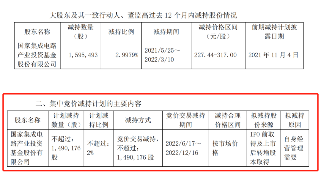 国产CMP抛光液龙头再被大基金减持,什么信号? 5月25日晚,安集科技发布公告称,公司第二大股东国家集成电路产业投资基金股份有限公司拟减持不超过2%,而这次公告距离上一轮减持结束刚刚过去2个多月。 今年以来,大基金已陆续宣布减持国科微、景嘉微、万业企业、长川科技等多家上市公司。有机构认为,大基金一期的良性退出,更有利于将资金针对性地投入到较为薄弱的设备材料领域,帮助国内企业在高额研发投入下打造更加良好的生态。 另外值得注意的是,近期半导体板块市场表现强势,短期反弹超20%,能否持续? 大基金拟减持不超过2%安集科技 安集科技5月25日晚公告,公司第二大股东国家集成电路产业投资基金股份有限公司(以下简称“大基金”)因自身经营管理需要计划自本公告披露之日起15个交易日之后的6个月内,通过集中竞价交易方式减持不超过149.01万股,减持股份占公司总股本的比例不超过2%。减持价格将根据市场价格确定。 值得注意的是,这次公告距离大基金上一轮减持结束刚刚过去2个多月。2021年5月25日-2022年3月10日,大基金减持安集科技159.55万股,减持比例约3%,减持价格为227.44-317.00元/股。 截至最新公告,大基金持有安集科技股份618.56万股,占比8.30%。上述股份均为首次公开发行前持有的股份及上市后以资本公积转增股本方式取得的股份。 据悉,安集科技主要产品包括不同系列的化学机械抛光液和光刻胶去除剂,主要应用于集成电路制造和先进封装领域。大基金一期最早在2016年7月投资安集科技,投资金额为1.09亿元。三年后,安集科技在科创板上市,上市发行价为39.19元/股,彼时,大基金一期持有安集科技股份614.46万股,占公司总股本11.57%,系第二大股东。 截至5月25日,安集科技报210.2元/股,总市值为156.6亿元。 大基金二期投资以晶圆制造为主 不仅安集科技,今年以来,大基金已陆续宣布减持国科微、景嘉微、万业企业、长川科技等多家上市公司。 据了解,大基金成立于2014年,由国家财政、国开金融、亦庄国投代表北京市及北京经济技术开发区发起设立。大基金一期成立时募资1387.2亿元,撬动设备资金超过5000亿元,投资范围包括制造、设计、封测、装备、材料以及生态环境等方面的全覆盖。 随着投资完成并进入回收期,大基金二期开始承接一期的职责继续投资中国半导体产业。2019年10月22日,大基金二期正式注册成立,注册资本2041.5亿元人民币,共有27位股东,包括财政部、国开金融、中国烟草等国家机关部门以及国家级资金,还有地方政府背景资金、央企资金、民企资金等。 安信证券指出,随着大基金一期的良性退出,更有利于将资金针对性地投入到较为薄弱的设备材料领域,帮助国内企业在高额研发投入下打造更加良好的生态,早日实现在关键领域上对国外设备的进口替代,扶持国内半导体设备企业做大做强,极大地推动了国产设备在国内的渗透率提升,国产半导体设备将站上风口浪尖。 中信建投证券研报显示,截至2022年一季度末,大基金二期共宣布投资38家公司,累计协议出资790亿元。大基金二期投资涉及集成电路全产业链,其中,晶圆制造投资额约594亿元,占比最高达75%,集成电路设计工具、芯片设计投资额约81亿元,占比10%;封装测试投资额约21亿元,占比2.6%;装备、零部件、材料投资额约75亿元,占比10%;应用约19亿元,占比2.4%。大基金二期重点关注的设备包括刻蚀机、薄膜设备、测试设备、清洗设备等,材料方面则涵盖大硅片、光刻胶、掩模版、电子特气等。 半导体近期强势反弹,可否持续? 年初至今,市场迎来剧烈调整,半导体板块也一路震荡下行。而值得注意的是,半导体板块在近期迎来了一波强势反弹,4月27日至5月23日,申万半导体指数涨幅达22.29%。但随后的5月24日,指数一日跌去4.20%。那么,半导体板块这波反弹的原因是什么?能否持续? 天相投顾研究员杜正中近期指出,半导体行业的反弹有两方面原因:一是自4月底至今,A股市场表现强势,迎来一波中等级别反弹,相对于国际市场走出独立行情;二是半导体行业作为弹性较强的板块,在市场上回暖的情况下反弹力度可能更大。 诺安基金相关人士表示,今年一季度受美联储加息、俄乌冲突,以及国内新一轮疫情影响,市场风险偏好急剧下降,半导体等成长类赛道杀估值现象严重。从全行业2022年一季报业绩来看,半导体行业的增速名列前茅,基本面数据强劲,导致半导体行业的基本面和市场情绪的剪刀差逐渐加大。随着疫情的逐步企稳,半导体一季报业绩纷纷超预期,半导体行业的估值回归理性。 不过,华泰证券提示了两点风险:一是加息导致股票市场波动。近期,市场对于美联储 2022 年加息可能性及次数预期持续提升。若美国在年内多次加息,将显著影响高估值板块如半导体板块估值水平,导致股价波动。二是贸易摩擦影响投资情绪。若美国继续收紧对晶圆厂设备、材料和 EDA/IP 等美国技术的出口管制,公司发展或面临一定的不确定性。 展望后市,金信基金认为,首先,根据美国成熟市场的经验来看,由于受下游应用端需求周期的影响,半导体产业确实具备较强的周期性,所以当下游需求周期下行的阶段,半导体板块整体也会出现下行趋势。但和美国市场情况不同的是,国内半导体产业正面临国产替代的时代大背景下,处于高速成长期,很多细分行业呈现出了“重成长”而“轻周期”的逻辑。例如,根据头