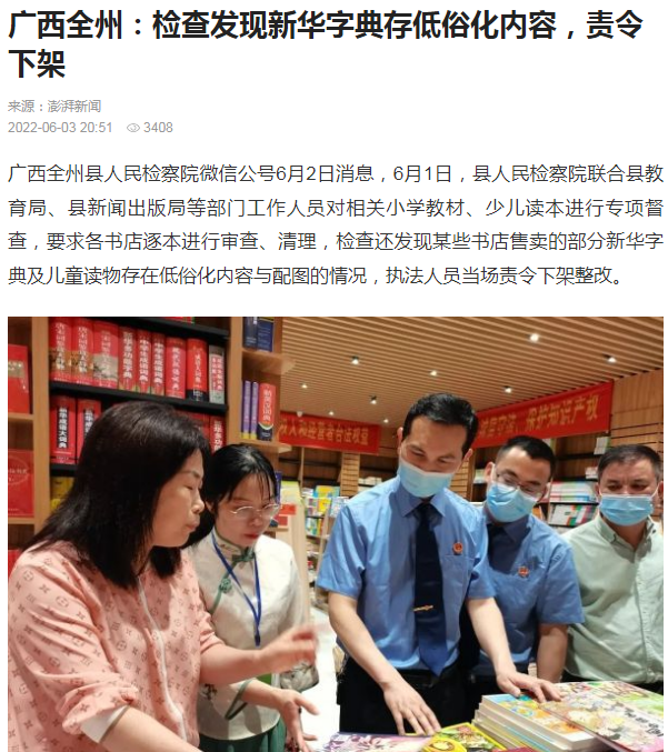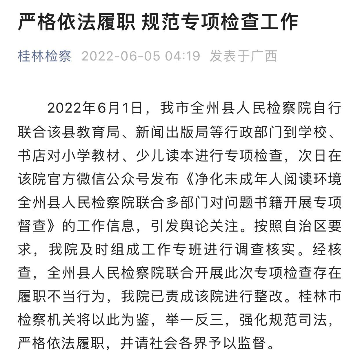 每经编辑 彭水萍 “桂林检察”微信号6月5日凌晨消息,桂林市人民检察院发文称,经核查,全州县人民检察院联合开展对小学教材、少儿读本的专项检查存在履职不当行为,并已责成该院进行整改。 原文如下: 严格依法履职 规范专项检查工作 2022年6月1日,我市全州县人民检察院自行联合该县教育局、新闻出版局等行政部门到学校、书店对小学教材、少儿读本进行专项检查,次日在该院官方微信公众号发布《净化未成年人阅读环境 全州县人民检察院联合多部门对问题书籍开展专项督查》的工作信息,引发舆论关注。按照自治区要求,我院及时组成工作专班进行调查核实。经核查,全州县人民检察院联合开展此次专项检查存在履职不当行为,我院已责成该院进行整改。桂林市检察机关将以此为鉴,举一反三,强化规范司法,严格依法履职,并请社会各界予以监督。 此前,据正观新闻转澎湃新闻报道,广西全州县人民检察院微信公号6月2日消息,6月1日,县人民检察院联合县教育局、县新闻出版局等部门工作人员对相关小学教材、少儿读本进行专项督查,要求各书店逐本进行审查、清理,检查还发现某些书店售卖的部分新华字典及儿童读物存在低俗化内容与配图的情况,执法人员当场责令下架整改。 上述消息提到,近日,人教版小学数学教材插图以及各类儿童书籍频繁上热搜,受到社会广泛关注,其插图内容存在人物面貌丑陋诡异、场景行为不当、中国地图、国旗画错等问题引发争议,也加剧了大众对孩子审美和心理健康发展的忧虑。为学生营造良好的读书环境,促进学生身心健康发展,6月1日,全州县人民检察院联合县教育局、全州县新闻出版局等部门工作人员,深入全州县2所小学、新华书店等城区多家书店对相关小学教材、少儿读本进行专项督查,充分履行未成年人检察、公益诉讼检察职能。 来源:每日经济新闻综合“桂林检察”微信号、正观新闻 |