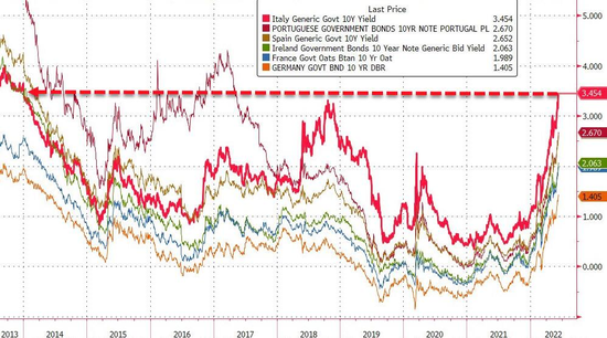 来源:华尔街见闻 作者: 韩旭阳 欧债风险指标接近“危险区域”,令欧洲央行承压。 欧洲债券市场的抛售没有显示出任何缓和的迹象,这加大了欧洲央行的压力;同时欧盟“分裂”加速,市场正考验着拉加德的“不惜一切代价”时刻。 几个月来,投资者一直在关注各国央行将以多快的速度使货币政策正常化以抑制通胀。 周四,欧洲央行确认量化宽松时代结束,并在实施了8年的负利率政策后,发出了加息信号。欧洲央行决定自2022年7月1日起终止资产购买计划的净资产购买,这为7月加息铺平了道路。 欧洲央行在声明中表示,计划在7月加息25个基点,并预计9月份有进一步行动,还表示预计9月份之后将“逐步但持续地”加息。欧央行行长拉加德在随后的发布会上也表示,如果中期通胀前景持续或恶化,那么9月将适合更大增量的加息幅度。 拉加德以非常强硬的姿态,承诺结束债券购买并开始加息。但这一切都面临着滞胀的威胁,因为欧洲央行显然削减了经济增长的前景,并提高了通胀预期。 不过,在谈到欧洲债券市场的“分散化”时,她也确实提供了一些希望。她承诺,欧洲债券市场有一些“工具”来解决这个问题,就像面临着一种需要“不惜一切代价”的时刻。 周五,德意志银行大幅下调了德国2022年及未来两年的增长预期,称俄乌冲突和持续的高通胀似乎将在可预见的未来对这个欧洲最大经济体施加压力。德银对欧央行的加息节奏预期十分鹰派,预计欧洲央行将在余下的时间里加息50个基点,而且是两次。 在今年晚些时候可能出现的更激进的加息周期,打击了市场情绪。而且,市场认为拉加德只是在虚张声势。今日欧股开盘下跌,随后跌幅一路扩大。截至目前,欧洲stoxx 50指数跌超2.5%,德国DAX指数、法国CAC40指数跌超2%,英国富时100指数跌2%。 在欧洲股市的暴跌中,意大利股市受创最严重。意大利MIB指数跌4.6%。 意大利的“货币单位重新调整风险”——大致可以理解为意大利退出欧元区的可能性,明显加速到了不可忽视的水平。 欧洲国家债券息差扩大 欧洲债券收益率一路飙升,欧猪五国(PIIGS)的国债收益率与意大利债券收益率明显脱钩,后者目前处于2014年以来的最高水平。2年期意大利国债收益率一度跳涨20个基点至1.61%。 并且,意大利10年期国债与德国10年期国债的收益率差连续第三天扩大,目前达到了226个基点,为2020年5月以来最大。这使这一衡量该地区风险的关键指标更接近250个基点的临界值,策略师们此前已将这一临界值确定为可能引发决策者采取行动的“危险区域”。 Futures First 的分析师 Rishi Mishra 表示: 意大利的债券将不得不再卖出一些,才能让欧洲央行采取行动。 “分裂”加速 拉加德不得不采取行动 除了从7月开始的一系列加息计划外,拉加德还强调了官员们阻止欧元区内部分裂的决心。法国央行行长 Francois Villeroy De Galhau 周五重申了这一观点。 但他们没有详细说明任何新工具,比如另一项债券购买计划。一些投资者和分析师认为,随着欧洲央行在未来几个月开始加息,为了防止债务较重的地中海经济体的金融条件过度收紧,这些新工具是必要的。 法国兴业银行利率策略师 Jorge Garayo 写道: 在欧洲央行采取行动之前,这种为息差提供支撑的模糊做法意味着,欧洲政府债券市场必须首先进入危机模式和进行无端的利差扩大。 这种溃败还蔓延到了希腊债务,希腊债务被认为比意大利债务对欧洲央行的货币政策更为敏感。希腊10年期国债收益率也处于2018年以来的最高水平。 据包括 Antoine Bouvet 在内的荷兰国际集团策略师表示,到目前为止,这些行动是“有序的”,但如果欧洲央行政策制定者不采取进一步行动,不清楚这种情况还会持续多久。 在一些策略师看来,可能会有更多负债累累的国家因借贷成本上升而承受巨大压力,从而迫使欧洲央行完全停止加息。 包括 Jamie Searle 在内的花旗集团策略师在给客户的报告中写道: 欧洲央行大举加息、导致分裂,然后推出新的工具来应对,这没有太大意义。 更有可能的情况是,如果最初的快速加息加剧了意大利BTP债券与其他债券息差的急剧扩大,这将会打破加息周期。 |