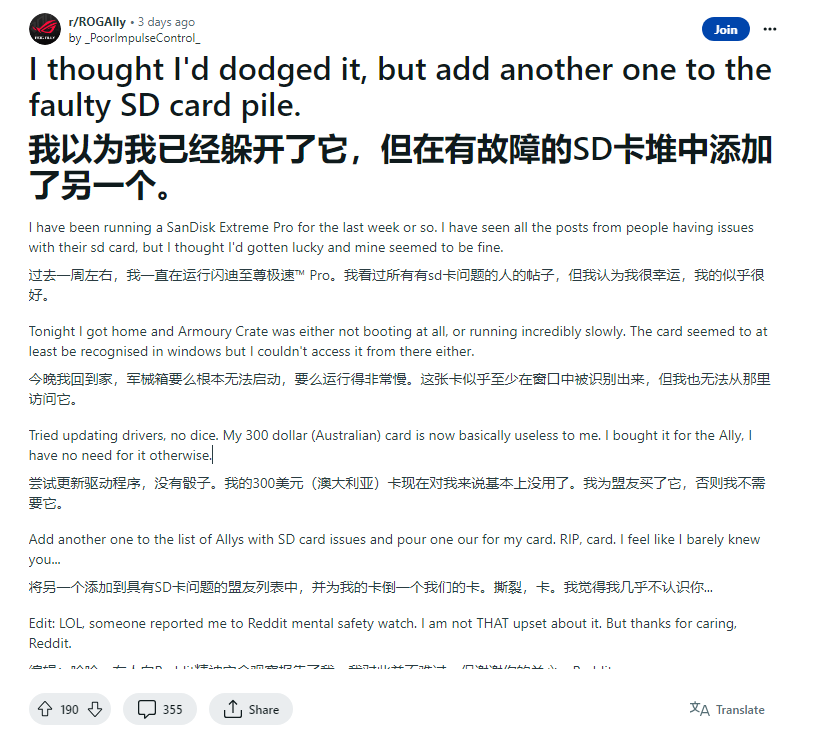 IT之家 6 月 30 日消息,根据国外科技媒体 Windows Central 报道,华硕 ROG Ally 游戏掌机发售之后,有部分用户反馈由于设备发热,破坏 MicroSD 卡插槽,导致存储卡无法正常使用。 IT之家注:MicroSD 卡插槽位于 ROG Ally 掌机外部通风口旁边,玩家在 Turbo 模式下玩高负载游戏时候,通风口位置会排出热量。 根据 Reddit 社区 r/ROGAlly 上玩家反馈,安装到 ROG Ally 上的存储卡会出现无法使用的情况。 部分玩家表示在 ROG Ally 使用之后,存储卡连接 PC 之后就无法读取了,即便是更新驱动也无效。部分用户表示 Win11 系统虽然可以识别该 SD 存储卡,但无法执行复制、粘贴操作。 广告声明:本文含有的对外跳转链接(包括不限于超链接、二维码、口令等形式),用于传递更多信息,节省甄选时间,结果仅供参考。IT之家所有文章均包含本声明。 |