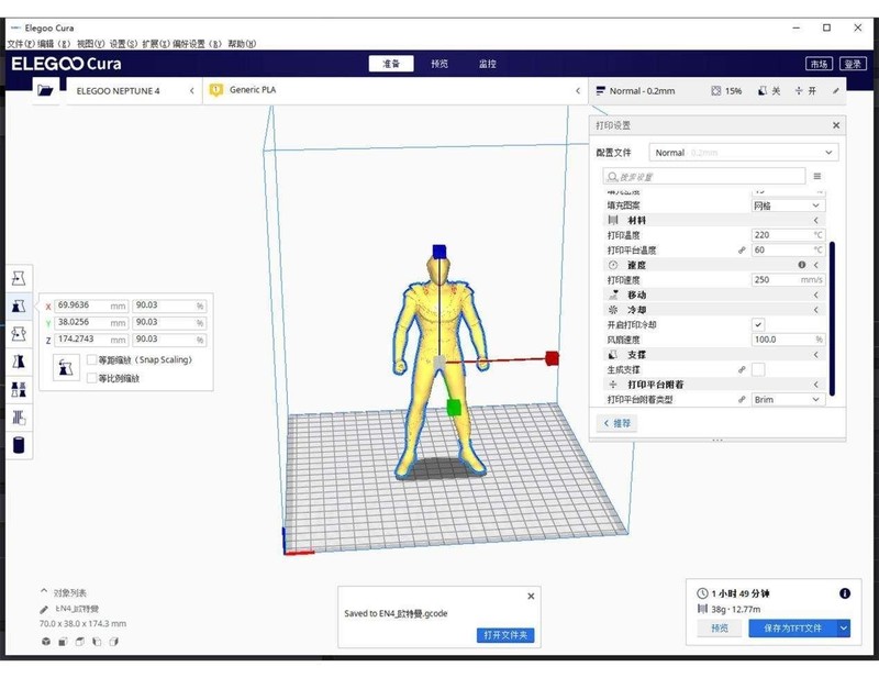 近几年,3D打印技术越来越先进和普遍,市场上也有了很多不同的3D打印机品牌和产品。其中,蜚声海外的ELEGOO爱乐酷在国内也拥有非常多的支持者。最近,他们又推出了四款新的3D打印机产品,其中ELEGOO爱乐酷Neptune4海王星卷王机是一款FDM3D打印机,引起了很多人的注意。我也不例外,下面就让我们来看看它的性能和特点,以及它在3D打印领域中的应用潜力。 开箱 作为一款高性价比的消费级3D打印机,ELEGOO爱乐酷Neptune4的包装设计相当得当,整体防护效果非常出色,能够充分保护机器在运输过程中不受损坏。海王星4的包装布局也十分合理,让用户可以一步步地进行安装,简单易行。值得一提的是,海王星4的配件包也做了严格的分类,每个零配件都有其对应的包装袋,这使得零配件的安装和存放变得更加方便。作为用户,拥有这样精心设计的包装和配件布局,不仅能够让我们更加放心地使用海王星4,还能够减少复杂操作所带来的麻烦和困扰。 配件 除了优秀的包装和防护措施外,配件的完整性和实用性也同样重要。作为一款优秀的3D打印机,海王星4的配件非常丰富,涵盖了用户在使用过程中可能会遇到的各种情况和需求。此外,配备的测试打印材料和用户指南也能让用户的快速入门和使用提供了有效的帮助。 上手安装 海王星4的安装过程非常简单,U盘内也提供了安装视频指引,方便用户快速上手。值得一提的是,海王星4采用独具一格的型材外形设计,机器为龙门架结构,整机更加轻便、美观,快速组装维护,轻松上手打印。而采用的Z轴双丝杆+双电机设计则能让运行更加平稳,调平更准确,打印质量更好,精度更高。 海王星4配备了磁吸一体式4.3寸电容显示屏,只需接上链接线路即可使用,无论是手持还是固定在机座上操作都没有问题。在操作界面上,机器支持简体中文、英文、西班牙语、法语等多国语言,简介的操作界面也让人操作无忧。 接好龙门架、操控屏和对应的接口后,接下来是料管和缺料检测器安装。 在安装缺料检测器的时候,需要将线路插入的对应接口,然后依据说明书和安装教程进行固定,确保其正常工作。 海王星4在安装结束后可通过手拧螺母来调节皮带松紧度,皮带松弛后方便调节,提高打印精度。 海王星4顶部还配备了30颗高亮灯珠组成的灯条,搭配遮光罩一同使用,灯光明亮不刺眼。另外还配备有模型灯,照明灯和模型灯均可在屏幕按钮自由开启和关闭,方便在光线不足的环境观察模型打印情况。 接口 在机身的接口方面,海王星4配备了屏幕连接接口、usb接口。这些丰富的接口,使得海王星4在文件传输和数据连接方面更加灵活多样,能够满足用户多种功能需求。此外,海王星4不仅支持传统的U盘打印,还支持通过网线进行局域网联网打印,联网后可使用网页端后台进行远程打印和监控,使打印更高效和便捷。 功能体验 海王星4采用了全新升级近端双齿轮挤出机构,5.2倍挤出比,挤出力度更大。搭配铜-钛全金属耐高温喉管和高速喷嘴设计,打印时耗材能快速充分熔融,进退料更均匀、顺畅的同时,有效避免了挤出机的跳齿问题。另外海王星4的V轮由优质POM材料加工而成,具有超静音、高精度、耐磨损的优点。同时机器传动机构配有偏心隔离柱,可以弥补因长期打印磨损V轮带来的打印精度下降。 海王星4支持3种打印模式,最高支持500㎜/s的打印速度,真正做到为速度而生,搭配64位处理器的计算能力和优异的运动控制算法,精准的计算步进时间,实现更高的运动精度。 而实现高速打印当然少不了优秀的散热系统。海王星4在散热方面采用的是智能飓风散热系统,该系统搭载7个高转速滚珠风扇,其中3风道散热风扇+强力辅助散热模块,挤出机风量大幅提升,快速打印时可极速全面散热,减短散热路径,整机散热能力飙升,有效降低堵塞风险。机器在打印完成后,当喷头温度低于50℃,喷头散热风扇会自动停止工作,降低能耗。 在打印平台方面,海王星4采用了特殊PEI涂层+弹簧钢板+软磁贴三种结合的创新型打印平台,这种结构不仅具有出色的附着力和抗翘曲性,可以确保打印件紧密粘附在平台上,同时还有效避免了打印件的翘曲等问题。 打印完成后,海王星4的打印平台能够快速降温,并自动脱落打印件,这不仅有利于节省时间成本,还让用户能够更加轻松地取下打印件,避免因拆卸而损坏打印件的情况发生。搭配250W大功率热床,可快速加热到110℃,满足不同耗材对热床的温度需求。 在打印尺寸方面,海王星4支持主流的225*225*265mm?的打印尺寸,用户在打印各种尺寸的模型时,能更加随心所欲,尽情释放创造力。 设备在首次使用前需要进行调平工作,海王星4支持自动+手动双重调平,这对于不同需求的用户而言非常实用。首先,海王星4采用非接触式高精度传感器自动检测打印平台上的121个点并实时采集数据,实现自动校准和补偿喷嘴与热床之间的距离一键调平,这样,可以省去用户手动调整打印平台的繁琐步骤,提高打印效率。其次,海王星4也可以通过手拧螺母校准平台和调整Z轴高度来补偿打印平台的水平度,提升打印成功率。这对于有经验的用户而言也非常便利。 在上料方面,海王星4的操作非常简单,只需要将线料挂在料管上,然后穿过缺料检测器,插入挤出机即可,同时,在屏幕上进行进料操作就可以了。此外,在耗材方面,海王星4支持多种耗材,如PLA、PETG、ABS和柔性长丝如TPU等。 海王星4支