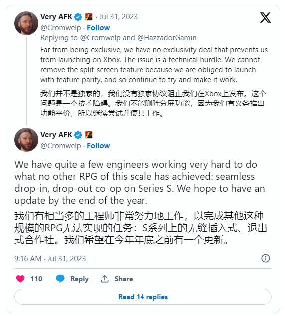 IT之家 8 月 2 日消息,《博德之门 3》是由 Larian Studios 开发和发行的游戏,将于 8 月 3 日登陆 PC 平台;9 月 6 日登陆索尼 PlayStation 5 平台。 Larian 发行总监近日在推文中表示,由于开发团队正在克服一个“巨大的技术障碍”,预估在 2024 年之前该游戏不会登陆 Xbox 平台,并计划在 2023 年底之前提供开发的最新情况。 Larian 发行总监表示《博德之门 3》并未签署独占协议,由于 Series S 游戏主机在本地联机模式下无法正常工作,因此需要针对微软 Xbox 平台进行优化。 IT之家在此附上 Larian 官方更新日志中的内容如下: 我们一直致力于将游戏推向尽可能多的平台。我们对《博德之门 3》在 Xbox Series X 上的表现持乐观态度,但我们仍需确保游戏在 Xbox X / S 生态系统中的多人游戏和分屏模式中无所妥协地运行。 我们已付出巨大努力,将继续披荆斩棘。就如 PS5 版本一样,一旦一切准备就绪,我们便会宣布发布。请保持关注,我们将尽快更新信息。 广告声明:文内含有的对外跳转链接(包括不限于超链接、二维码、口令等形式),用于传递更多信息,节省甄选时间,结果仅供参考,IT之家所有文章均包含本声明。 |