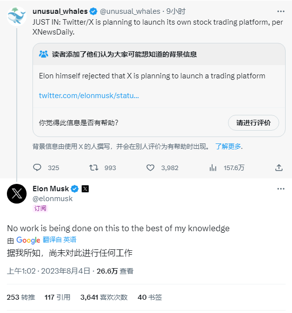 IT之家 8 月 4 日消息,根据新闻网站 Semafor 报道,X(推特)正寻求和金融数据巨头公司合作,搭建一个金融交易平台。 马斯克随后在推文中并未正面否认,只是表示:“据我所知,目前还未展开相关的工作”。 IT之家注:Semafor 是一个新闻网站,由《纽约时报》前 BuzzFeed 新闻主编兼媒体专栏作家本?史密斯和彭博媒体集团前首席执行官贾斯汀?史密斯于 2022 年创立。 Semafor 在报道中指出,X(推特)近日向多家金融机构发出邀请,在信函中表示:“尤其在投资领域,掌控实时信息就是掌控一股巨大的力量”。 X(推特)公司希望这些机构提供金融内容、实时股票数据和其他功能;而 X(推特)可以让其能够接触到“数亿高素质用户”。 该请求要求感兴趣的投标人说明他们自己将为该项目投入多少资金。目前尚不清楚哪些公司(如果有的话)提交了上周到期的提案。 广告声明:文内含有的对外跳转链接(包括不限于超链接、二维码、口令等形式),用于传递更多信息,节省甄选时间,结果仅供参考,IT之家所有文章均包含本声明。 |