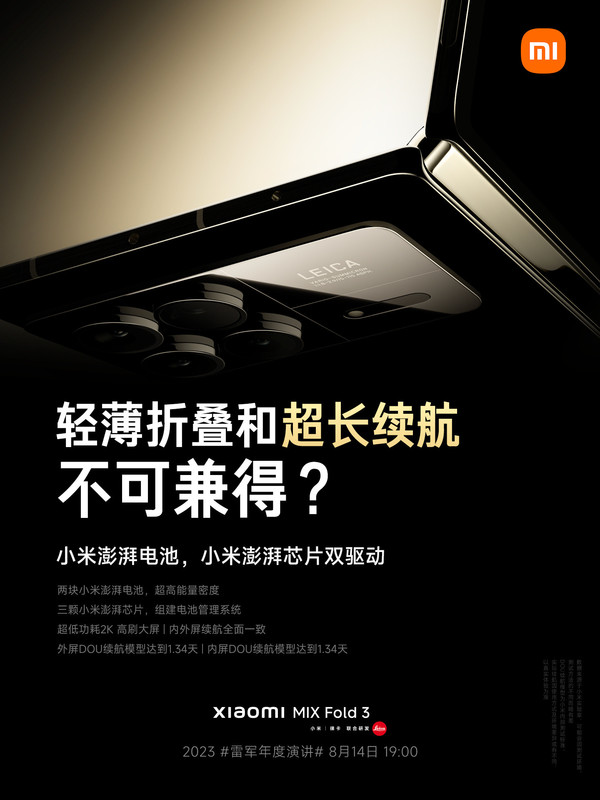 小米MIX Fold3有三颗自研澎湃芯片加持 续航可达1.34天! 【手机中国新闻】8月10日,小米手机再度针对即将于8月14日发布的小米MIX Fold 3折叠屏手机进行了预热。根据小米手机的介绍,这次的小米MIX Fold3折叠屏,可以放心随便用,无论是内屏还是外屏,这款手机的DOU续航模型均高达1.34天。在小米MIX Fold3的内部,小米准备了两块小米澎湃电池和三颗小米澎湃芯片,它们是小米MIX Fold3续航持久的原因之一。 一般情况下,折叠屏手机的机械结构会影响到这款手机的内部设计,从而导致折叠屏手机体积虽大,但鲜少有配备大容量电池的产品。再加上大折叠屏手机的屏幕尺寸较大,屏幕耗电量相比普通直板手机更多。因此,很多折叠屏手机在续航方面的表现都较为一般。而如今,小米MIX Fold3似乎在续航方面做了不少努力。 根据此前小米的预热,小米MIX Fold3将会彻底推翻行业现有技术路径,以突破性的转轴创新,实现「技术换空间」,宣告折叠屏下半场的新标准。这款手机配备了小米龙骨转轴,这是跨时代的全新设计,让轻薄折叠和真旗舰可以兼得,同时能够实现50万次折叠无忧和45°-135°大角度自由悬停。影像方面,小米MIX Fold3后置全焦段徕卡光学四摄,其中包括一颗3.2倍光学变焦的长焦镜头以及一颗5倍光学变焦的长焦镜头,有三颗镜头支持OIS光学防抖。 版权所有,未经许可不得转载 (本文来自于手机中国) |