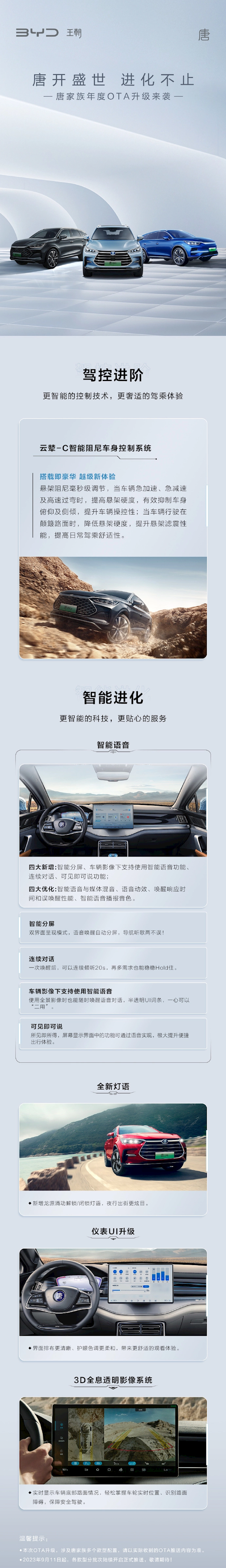 快科技9月8日消息,比亚迪官宣,唐家族车型将于9月11日陆续推送年度OTA升级,其中包含车主期待已久的云辇-C。 根据预告,比亚迪唐此次OTA升级,将新增云辇—C智能阻尼车身控制系统,可实现悬架阻尼毫秒级调节,在车辆急加速、急减速及高速过弯时提高悬架硬度,有效抑制车身俯仰及侧倾,提升车辆操控性。 与此同时,当车辆行驶在颠簸路面时,降低悬架硬度,提升悬架滤震性能,提高日常驾乘舒适性。 需要注意的是,并不是所有的唐车型都能升级云辇-C,根据此前官方清单,只有2022款唐EV 635KM四驱旗舰型、唐DM-p 215KM四驱旗舰型两款四驱车型。 比亚迪今年4月10日正式发布“云辇”技术,是一系列车身控制技术的集大成者,实现系统级深度集成。包含云辇-C、云辇-A、云辇-P、云辇X四种不同取向的车身控制系统,将搭载于不同品牌和车型之上。 云辇可以实时感知人、车、路三者的状态,可以满足在复杂路况下依旧保持车辆的舒适性。在安全方面,最高端的云辇系统可以让车辆哪怕损失了一个轮子的情况下,依旧可以正常行驶。 除了云辇-C外,此次OTA还升级了智能分屏、车载语音系统连续对话、可见可说、“龙源涌动”灯语,仪表UI等等。 【本文结束】如需转载请务必注明出处:快科技 责任编辑:随心 |