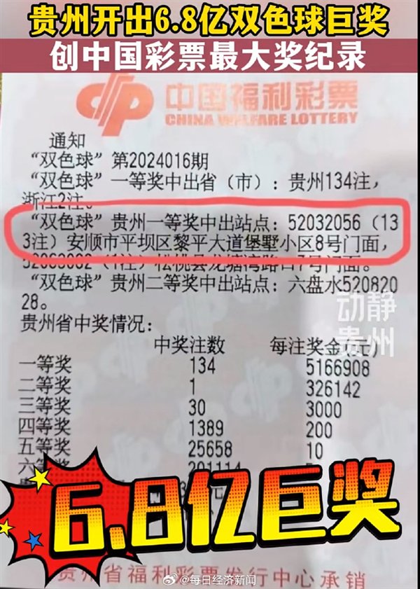 快科技2月8日消息,福彩双色球第2024016期开奖,本期136注一等奖有134注来自于贵州,且其中133注一等奖由一个投注站所中,总奖金达到6.8亿多元。 随后,这位中巨奖的主人公露面,是一位28岁的小伙,其在手机上查到了中奖的消息,激动得一晚上没睡着,天一亮就开车直奔贵阳领奖。 这是双色球历史上第40个亿元奖,此次贵州中出的6.8亿巨奖奖金,排名国内彩市及双色球亿元奖历史双榜第1。 据悉,开出巨奖的投注站地址为贵州安顺市平坝区黎平大道堡墅小区8号门面,编号为第52032056号。 该投注站现已化身附近居民的“打卡地”,今天有好多人看到新闻后纷纷来购买彩票,“我自己也买了几注,想讨个好彩头。 按照贵州福彩发行中心的说法,中奖彩民需缴纳20%的个人所得税。但“现在因为彩民还没有来兑奖,具体的信息还没有,以官方信息为准”。经计算,按20%的计税方式,该彩民或需缴1.36亿税。 【本文结束】如需转载请务必注明出处:快科技 责任编辑:雪花 |