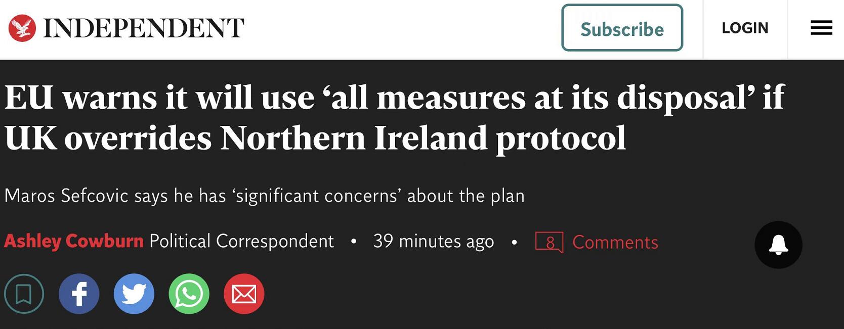 【环球网快讯】英国《独立报》17日刚刚消息,欧盟委员会警告,如果英国继续推行一项威胁性法案,推翻“北爱尔兰议定书”,欧盟将采取“一切可使用的措施”进行报复。 《独立报》称,当地时间17日早些时候,英国外交大臣特拉斯提出一项新立法,允许政府放弃英国此前和欧盟签订的“北爱尔兰议定书”的部分内容。特拉斯称,将在“未来几周”公布新立法。 不过,报道称,特拉斯提议立即引发了布鲁塞尔的回应,欧盟委员会副主席马罗斯·塞夫科维奇表示,他对该计划有“重大关切”,并称“无法接受抵触国际协议的单方面行动”。 《独立报》称,在塞夫科维奇的声明中,他还警告,欧盟将采取报复性措施。“如果英国决定推进该国政府于今天宣布的使“北爱尔兰议定书”的部分内容失效的法案,欧盟将需要采取一切可使用的措施作出回应。” 作为英国“脱欧”协议中至关重要的一部分,“北爱尔兰议定书”规定,不在北爱尔兰与爱尔兰之间设立硬边界进行贸易检查,即所有的贸易检查都将在北爱尔兰和英国之间进行。北爱尔兰主要政党民主统一党批评这一条款有利于北爱内部脱离英国的势力。 |